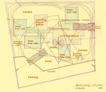 Freehand scaled sketch on onion skin of Plot Plan, buildings and wood “tent.”