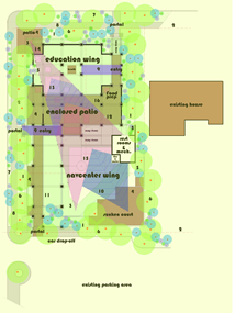 This version of the plan is worth study and consideration. I have not been afforded many opportunities to address the placement of a new building inside a traditional community in transition. The design illustrates many important design issues and suggests concrete solutions. The SDC Campus has to solve architectural problems of a similar kind [not see work #113]. |