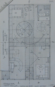 works every well creating zones of relative privacy in an entirely open room. This arrangement can be made to work in a traditional apartment building a loft or even some kind of temporary field structure. This mixed-use” zoning schema illustrates the organizational ideas behind many of my projects including the Organic City [see work #56], Vanguard NavCenter [see work #88], and my Bay Area Studio project [see work #96]. |