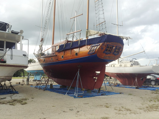 | CAMELOT ready to return to the water after the August 2013 haul out. The hull is in remarkably good shape considering sitting in warm, brackish, shallow, water with only three haul outs in ten years. What damage has been done can be fixed. For now She is dry inside with minimal bilge pumps running time. |