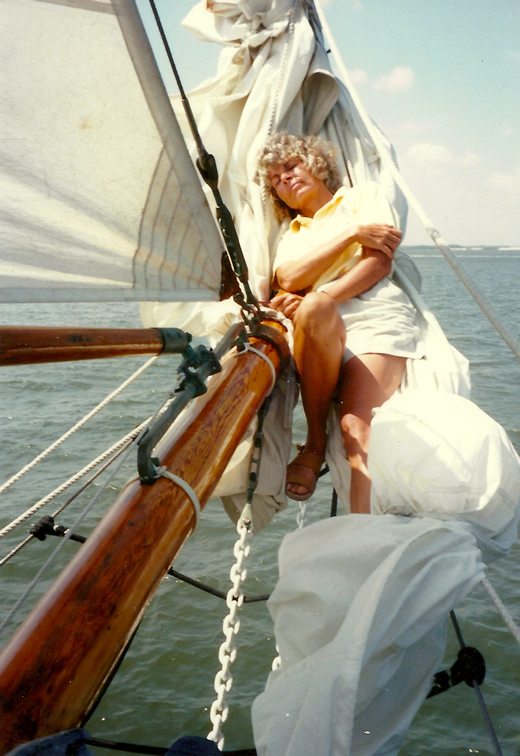 | CAMELOT has six sails with a 7th square sail for the main mast that legend has it was left on a bridge a number of years before our time with Her. There is a basic set of three: the mainsail, mizzen and cub foot shown in the picture of Gail which all are mounted on self tending booms. The basic set can drive the boat under most conditions and this makes handling with a single person on deck an easy affair except under storm conditions. You can see that the club foot can travel back and forth on the bowsprit. This is how it is trimmed to accommodate beating to the wind or sailing with a following wind. This sail is only a little over a 110 square feet, and CAMELOT once achieved 9.4 knots with this sail alone during a storm on our first trip to Bermuda. The wind and seas were following and it was quite a ride and one of my most exciting times at the helm. |