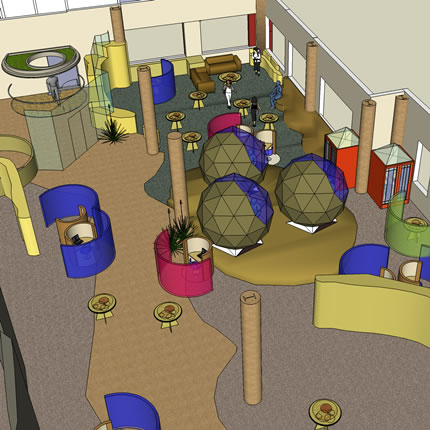 | The STREET starts outside at the open-air Patio and weaves its way through all of the environment touching and connecting all of the major and minor zones. This is a safe and stimulating ribbon-space from which all of the eSpaces environment can be touched without interfering with the functioning of any Zone’s activities. |