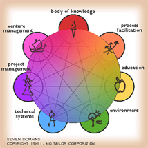 | We had to develop a number of new Models and definitions - terms of art - in order to precisely communicate what we were doing. Shown here is the 7 Domains Model which identifies the critical aspects that must be managed in a certain way in order to make the environment necessary for the creative organization. |