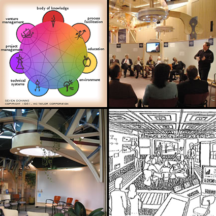 | The Center triangle in the 3 Cat Model is the system integration function we call a NavCenter. A NavCenter® [future link] is the highest expression of our Method that we can build, at any given moment, based on the principles and criteria expressed in the 7 Domains Model. The NavCenter® is an environment designed to facilitate knowledge work [link: knowledge workers - drucker‘s concept] in all it aspects from individual work to that of teams and large groups. It is in these environments that we do our work. They are also our research lab wherein we observe and learn about human creativity and collaborative processes. Over the last 25 years, more than 2,500 major organizations have attended DesignShops® [future link] provided by MG Taylor or our License holders. DesignShops are typically three to four 12 hour day events for 75 to 125 people in which a challenge is explored in depth, solved and and action plans developed. In these environments, as before noted, which we have designed and built, employed a patented process of our invention, configured technology to our specifications to augment the work, we have facilitated tens of thousands of people from all walks of life, disciplines, regions of the Earth and representing a broad range of human cultures. The problems solved have covered the entire range of human endeavor [future link]. Our Method is based on iteration, recursion and feedback [link: table 2 - principles of iteration feedback and rule of recursion pdf] . This is so within the inherent structure of the work, its application in every event and activity, and in the conduct of the practice of the work as it is has evolved over time. |