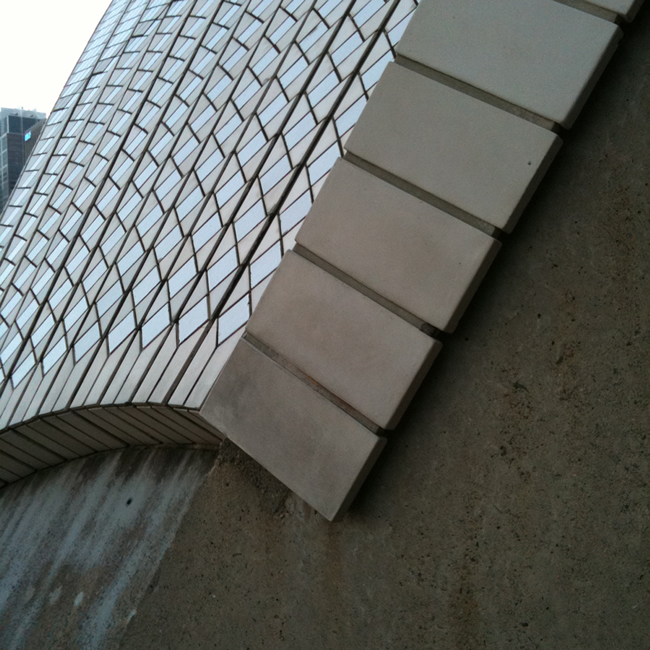 | The roof tiles were developed for the building. They are perfect for their task. Made of two colors and shaped to refract and reflect the light in a way that makes the great “sails” a constantly changing experience, at one moment almost translucent and ethereal, the next transforming to solid carved rock. |