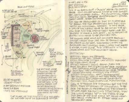 Hand Drawn Notebook Pages | | In parallel with these web pages, I have been making entries, related to the postUsonian project, in my hand drawn Notebooks. These are listed below. The concept that I will develop as a candidate for UsonianOne came into focus in these pages. It is far easier to design with a site in mind so I stared with the Elsewhere property [link]. Page 489, which contains the first sketch of an Elsewhere-postUsonian solution, is accordingly, used as the masthead for this URL. In actuality, as I develop the plans further to meet my mid September objective [link], I intend to use the Tillers [link] Project land as the site. This is an ideal location for a postUsonian for historical, and regional reasons and because of the project, itself, that the Tillers organization has taken on [link]. | | The concept that has evolved is not the only way to meet the postUsonian criteria that I have established. It is also on the upper end of complexity and most likely - at least at first - too costly for the majority of buyers. Once the complexity and manufacturing issues are solved, however, this design approach may actually yield complexity-cost reduction benefits. Even as a prototype, it can deliver many benefits and lead to environments that will be highly adaptable to a variety of sites and situations. It is, essentially, a suspended boat hull cantilevered above the ground. This structural schema has many advantages and the resulting configuration is tightly integrated: form, structure, utility, finish are one to a degree usually only accomplished in vehicles and industrial products not architecture that can be owner field built as well as shop manufactured. Spaces, with this concept, are adaptable to a variety of different uses that can cover the full range of family and home office demands. | | Schemas, both more “traditional” and “advanced” in their footprint and structural/mechanical configuration will have to explored in order to investigate the full range of the postUsonian potential. It is expected that these different approaches will inform on another and also lead to interesting combinations. This will be possible because of the unity of philosophy, Pattern language principles and key grammatical elements that make the core of the project. Scott Arenz and Matt Fulvio are also developing their own designs with this deadline in mind. This approach is expected to generate a greater degree of variety than would otherwise result if this project was initially approached through the narrower lens of one design. After September, we will most like pick on or some combination and pursue a single design to get to prototype. | computer_hand_work_differences | It is interesting to note the different character of documentation between the web site and hand drawn Notebooks. Different kinds of ideas come “out” in a different way in these two media. This is a factor of the media itself and my habits in regard when I use one or the other. Computers, as portable and easy to use as they have become, require the organization of batteries, cords and still require a work surface of some size. A hand drawn notebook is much more portable and and can be picked up and put down much easier. It is a far more tactile media. Graphics and sketches are easier. The physical mechanics of making are very different between hand and electronic. This means that the thought processes are different with each having intrinsic advantages and disadvantages. A hand process “draws” ideas out at a different rate and in a different way. I use it more when traveling, in waiting rooms, at restaurant and when sitting in bed although I use the laptop with these environments as well. The context set by these environments, and the time of day associated with their use, brings a different mental set to bear on the work. Their ambiance and the fact they range from public to private brings different nuances to bear. All this will show up in the work. The computer, also, has advantages. Posting to the web or transferring a document is much quicker and far less labor intensive. Many software tools can be brought into play much faster. The migration to a final document is faster. It can be added to, corrected and modified. These factor, also, are not neutral but effect the way work is approached. | | The hand drawn pages below are listed in reverse chronological order so that the story is told “backwards.” | |  | 515 08/16/04 postUsonian Project UsonianOne Design Elsewhere Tillers link: full screen view | |  | 496 06/27/04 Elsewhere postUsonian Deadline Economics of Building Studio: Two Years link: full screen view | |  | 491 06/11/04 postUsonian Key Factors Primary Message “Middle Class” link: full screen view | |  | 490 06/07/04 UsonianOne Elsewhere Studio EarthShip Section Grammar link: full screen view | |  | 489 06/05/04 postUsonian UsonianOne Elsewhere Studio EarthShip link: full screen view | |  | 487 05/20/04 postUsonian Key Elements Recursion Levels Earth as ART link: full screen view | |  | 484 05/05/04 UsonianOne Concept 21st Century Worker Architecture as ART link: full screen view | | [not yet scanned] | 363 04/08/03 Usonian House Factors Realization Process Rules of Engagement link: full screen view | | | | | Return To postUsonian Project Index | | | | | | Return To post Usonian Prototypes | | | | | | Return To Hand Notebook INDEX | | | | | Matt Taylor Chicago August 28, 2004 |  SolutionBox voice of this document: VISION PHILOSOPHY PROGRAM | August 28, 2004 revised August 29, 2004 • 20040828.512312.mt • 20040829.650120.mt • (note: this document is about 60% finished) Matt Taylor 615 525 7053 me@matttaylor.com Copyright© Matt Taylor 2003, 2004 | |