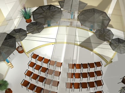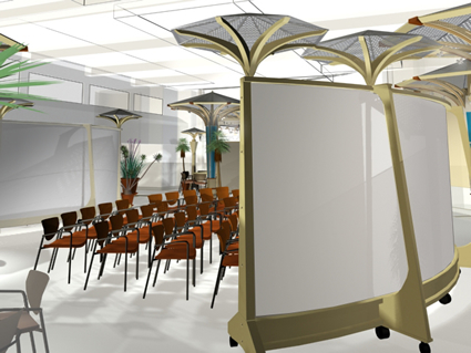 for the World Economic Forum 2006 and Beyond | | In 2005, the Davos WorkPlace was created. The story of its creation [link: innovation studio at wef] and first use [link: images of the 05 davos workplace] is told elsewhere. The physical environment part of this System (made up of work processes, environment and knowledge augmentation tools), was an effective and well received piece of architecture. It was, however, designed to the wrong specifications due to a set of circumstances that prevented the necessary level of collaboration between the World Economic Forum and MG Taylor [link: november 7 update]. What was created was a full capacity MGT RDS NavCenter. What the WEF requires is an RDS design space capable of supporting a variety of specific collaborative activities in a diverse set of circumstances. | | In early October, 2005, the WEF and MGT agreed, in principle, to reuse RDS elements in the WorkPlace in support of the 06 Annual Meeting, to transfer the way of working to the WEF and to build a new generation RDS environment [link: 7 domains vision 2005] appropriate for multiple deployments around the world and capable of supporting a wide variety of processes and events based on the Taylor Method and other modes of work and meeting styles. This specification will require a new generation RDS and one very close to the vision first dreamed of in 1983 [link: 1983 rds concept paper] [link: index of rds history and ongoing development]. | | | | The next generation RDS will make its debut in the Spring of 2006. As of this posting, November13, 2005, it is still in the Program/Schematic phase of development. At present, the design team is: Matt Taylor - concept; Bill Blackburn - design; Brian Ross - manufacturing - Irina Sokolova computer modeling and rendering. The WEF logistics, media and technical team will join the design process in early December. | | | The Armature system of this new RDS is a grouping of “Trees” that can be adjusted for height and connected together in various configurations. These trees are of three sizes and are supplemented with two different types of horizontal Armature trusses. Like all Armatures, lighting, power and media wiring runs through the Trees and trusses bringing lighting, power and multimedia where needed to almost any spot within the space. New to this generation Armature is the ability for the Trees and trusses to roll and, in some cases, hinge so that the entire set up can be reconfigured as needed in real time. | | | The geometry of the Tree clusters create rooms within rooms and layers of spaces - both horizontally and vertically. These areas can serve different functions and provide many places which express an unique sense of place. The dull boring meeting hall of undifferentiated space-less empty-ness, of no view and poor light is transformed into a landscape of rich materials, niches, vistas and spatial variety highlighted with shade and shadow and acoustic interest. The full scope of Pattern Language can be accomplished with manufactured components while allowing the environment to adapt, intimately, to the work and human mood within it - moment by moment, hour by hour, day by day, season by season. This is an organic environment which expresses and supports life and facilitates human dialog and creativity. | | | The Trees mediate between human scale and building scale. Most of what happens in most buildings is from 8 feet (two and half meters) down. Large rooms, necessary for large groups, are top-empty. By creating layers (fore ground, middle ground, back ground - horizontally and vertically), space - not emptiness - is created. Properly placed elements make a fine gradation from room-size to human-size to small-size (those objects smaller than people). The rhythm and modulation of these gradations of size serves architecture as does beat and syncopation does music. Scale relates to human-size. Proportion is the relationship between all of the parts. Proper scale and proportion is necessary for harmony to exist. Harmony is a major factor in the creation of peace of mind. Peace of mind allows one to reach beyond a just-personal concern and focus. Art shifts context - it opens the door to aspiration [link: ayn rand definition of art]. | | | Human-made light shining up to the Canopy (of Trees and down on it) can be controlled at each Tree column. This allows the space to be sculptured as is appropriate for the activity being supported. Natural light adds to this and can be “controlled” by the placement of the Trees and other elements. Light becomes playful like is found in a forest. It reflects, refracts, projects highlight on shadows, changes tone, hue and intensity - this is not your father’s painted box. If you want life to prosper while in an environment - give that environment life-like qualities. If you want people to be creative - put them in a place that celebrates it. If you want people to be collaborative - build them an environment that can only be made by the close collaboration of designers, engineers, craft-persons, logistics and project managers and do it with speed and economy. Show them that collaboration works. If you want people to be healthy - build with healthy materials. If you want people to be at ease, even as they work intensely - make a place abundant with positive social symbols and patterns. If you want intellect to flower - create a geometry and space ripe with rigorous, intricate, never-ending layers of precise relationships. If you want intuition to emerge and the soul to fly - then compose a symphony of visual music. Do this and then populate this PLACE with ideas, books, art objects, toys, puzzles and invite people in to play in a process environment of interaction, movement, engagement. Ask them to work on things that matter. Support them with augmentation technology that brings forth their genius. And, DEMAND their best. Make the creative economy/ecology. If you want dreams to come true - build dr