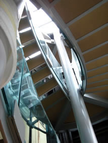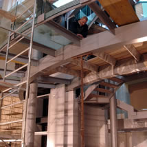The glass stairway by the elevators is almost finished and ready to get its glass treads. The stairs go up and project through the roof of the NavCenter portion of the project to the special education rooms on the floors above Access to all of these areas will be predominately through the front of the navCenter. This sets some interesting ENTRY conditions [link: navcenter entry]. The glass elevators and baloneys will be dominate features of the project and will both emphasize and bring scale to the vertical space of the great room. They provide an interesting view down to the main floor - present, yet detached.