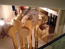 | On site, we discussed the erection process for the Armature. It will take a day or two to get the scaffolding in place and clear the area for this process. It will take a little over a week to get the Armature, up to the top of the Trusses, in place. Then electrical and multimedia wiring can begin. The layout confirms that the Armature will fit within the column boundaries about as the drawings indicated. There seems to be a few centimeters more clearance and this can easily be accommodated. It will be necessary to cover the Armature pieces to protect them from the final sheet rock and paint process. It would have been better to wait a few days to move the Armature pieces in, however, the bulk of the materials had to be moved over the weekend so as not to disrupt on site parking and other shipping. |