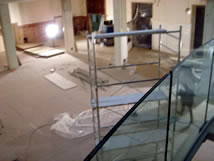 | The electrical rough, furring and glass floor section was started on the second balcony. It appears this will be completed by Monday or Tuesday. When we can get on on this balcony we will be able to see for the first time how the projection screens on this side of the building will “read.” |