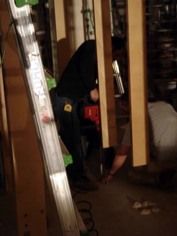 As the shroud around the HVAC is completed, wiring and mounts for speakers and projectors are being installed. The great room is a very bright acoustic space that can be tuned for great effect - this will take some time. |