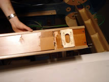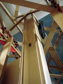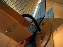 Forcellini putting in the truss wire chase which sits on the top of the “X” bracing and turns down at the ends of each truss. All wiring from the basement comes up through four slots at the bottom of each chase down turn. There will be two place, which I located today, where the wire chases in each horizontal run can connect cross-truss to each other. From these feeds, the wires spread out though the beams at each quadrant and into the three airfoils. In this way all devices and lighting fixtures are served.