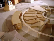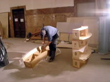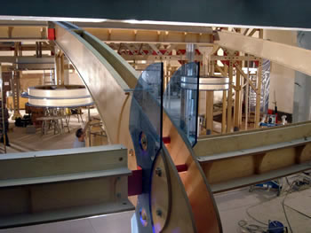 | This week we will begin to gear up for greater production. The most difficult work is behind us. The AE crew will join us from Switzerland. Forcellini will focus on making wire chases, multimedia brackets and several pieces of WorkFurniture (12 Media Trees, etc) which we are building here. AE will prepare the Armature to receive the suspension system. |