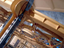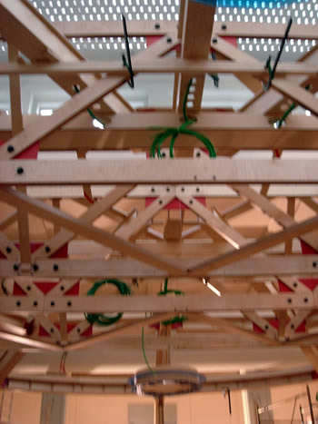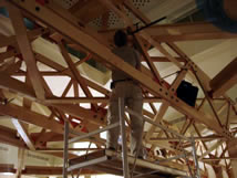 Because the live load of equipment has been considerably increased, from its original design assumptions, we have beefed up the structure considerably. This work includes blocking, gluing and screwing what were sections that could be disassembled, added steel plates, support brackets to existing columns and the suspension system yet to be erected. The beams and the suspension system are locked by a new compression ring that ties the two trusses together at their center. The load from the outer airfoil ring is transferred to the center of the trusses to act against the deflection imposed by the beams and the trusses own spans.