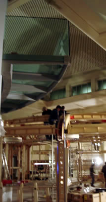 | A very good day. Nearly had a clash at on point between the Italian and Swiss contingents but that was ironed out quickly. Someone coming in the morning and returning in the evening would not see a great deal of difference. The work accomplished was almost invisible but critical. Forcellini’s team put the new wire chases in place. These, per the request of the Permasteelisa electrician, are 30 percent larger than the originals. The AE team put on most of the additional brackets, designed to reinforce the airfoils, and started the final squaring and leveling of the entire structure - these are minute adjustments but necessary for the suspension system to have a level base. Mike cut access holes, for wires to “skip” from one channel to another, for the electrician. Bolts were tightened everywhere. The Armature is just about as good as it can be and it ready for the next phase: putting on the suspension components. |