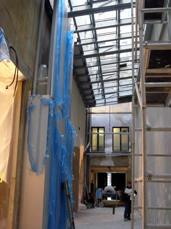 | The AE Swiss crew is here and preparing the Armature for the suspension system, the first element of which arrives this week. The Forcellini crew is working on wire chases, brackets and hangers for the multimedia system. Permasteelisa says they will be substantially out of the space by the end of this week - they are in high high gear now. Everyone on the project seems to be highly focused. The “exterior” part of the Garden is almost closed in and ready for waterproofing, earth and planting. This will feature eco the interior courtyard so typical of European cities and provide a reflection place for reading and contemplation. It also provides an interesting sourse of backlighting to the Radiant Room. |