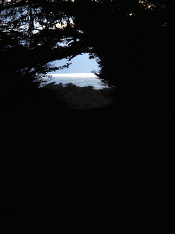 | Gail and I went for a walk overlooking the beach today and I took this picture. Somehow it seems to belong in this narrative. A peek at the sky, just before sunset, through the windblown coastal pines. |