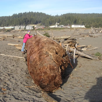 | Gail and I went for a walk on the beach and found this redwood log. It came in from the sea yet had not been there long as it was still fresh and red. The seas have been high this trip home and it is always a surprise what can be found. I would not have liked sailing into this at night on Camelot [link: why camelot]. Earlier today, Matthias and I met and worked through some agreements for Stan’s project. The thought of being home for a few months in early summer and building this addition is a pleasing one after the last year of travel and less than 8 weeks home in total in 06. |
